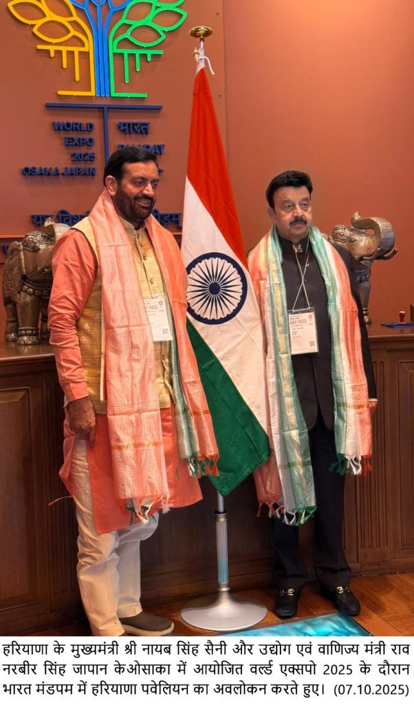 चंडीगढ़, 7 अक्तूबर – हरियाणा के मुख्यमंत्री श्री नायब सिंह सैनी जापान के ओसाका में चल रहे वर्ल्ड एक्सपो-2025 में आज हरियाणा पवेलियन के उद्घाटन अवसर पर उपस्थित जनों को संबोधित करते हुए कहा कि भारत के समग्र विकास में हरियाणा की महत्वपूर्ण भूमिका है। इस समय जब देश संसार की बड़ी आर्थिक शक्ति के रूप में उभर रहा है और प्रधानमंत्री श्री नरेन्द्र मोदी ने पांच ट्रिलियन अर्थव्यवस्था का लक्ष्य रखा है, तो हरियाणा इसमें अपना अधिकतम योगदान कर रहा है।