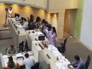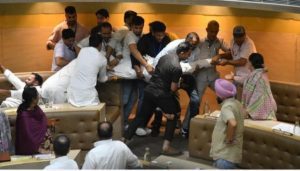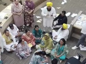कांग्रेस-आप कौंसलरों ने वैल में आकर मेयर के आगे एजेंडे की कापी फाड़ी, उनको बाहर निकालते वक्त धक्का-मुक्की