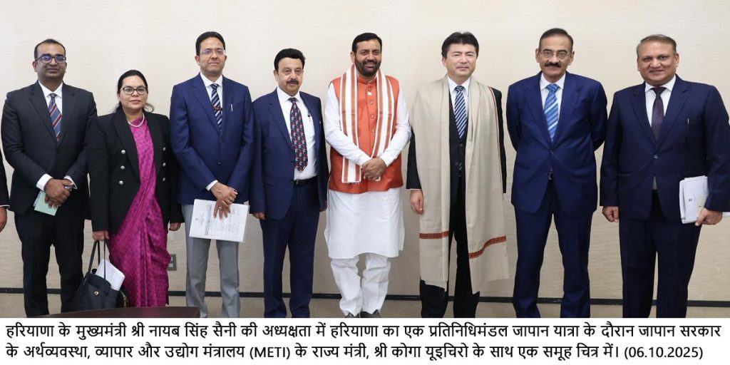 चंडीगढ़, 6 अक्तूबर — हरियाणा के मुख्यमंत्री श्री नायब सिंह सैनी के नेतृत्व में जापान के दौरे पर गए उच्चस्तरीय प्रतिनिधिमंडल ने आज टोक्यो में जापान के वरिष्ठ मंत्रियों के साथ द्विपक्षीय चर्चाएं कीं। बैठकों के दौरान हरियाणा और जापान के बीच आर्थिक, औद्योगिक एवं सांस्कृतिक सहयोग को बढ़ावा देने और सुदृढ़ करने पर विस्तृत चर्चा हुई। इस दौरान हरियाणा के उद्योग एवं वाणिज्य मंत्री राव नरबीर सिंह भी उपस्थित रहे।